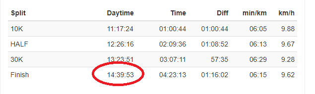 Search for yourself using your name (surname, firstname) or number and the time you finished is the Daytime column